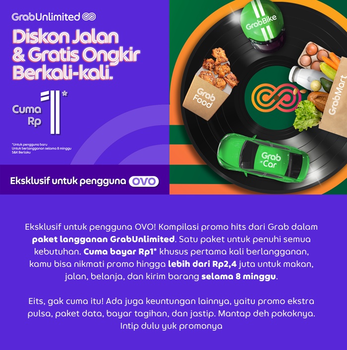 Eksklusif untuk pengguna OVO! Kompilasi promo hits dari Grab dalam paket langganan GrabUnlimited.