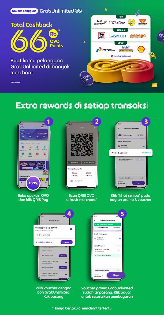 Raih extra rewards di setiap transaksi hingga 66rb OVO Points di banyak merchants.